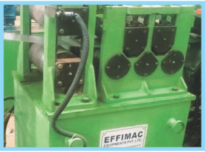 The machine consists of a welded frame with 2 side members. holding the bearing chucks. and bolted to each other via spacers and cross pieces. The chucks for the lower pinch and levelling rolls are rigidly mounted in the side members. The top pinch roll is raised and lowered by hydraulic cylinder. The upper levelling rolls are parallel adjustable by screw down devices. Pairs of horizontal and vertical guide rollers, adjustable to suit the strip width, are mounted at the entry side of the machine. The upper pinch roll is powered by A.C. geared motor via universal point propeller shaft.